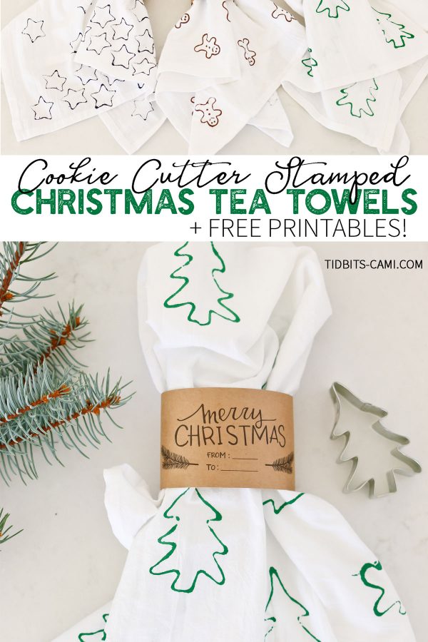 Darling Cookie Cutter Stamped Christmas Tea Towels the whole family can enjoy making for some fun DIY Holiday gifts.  Free printable label wraps available and a video tutorial!