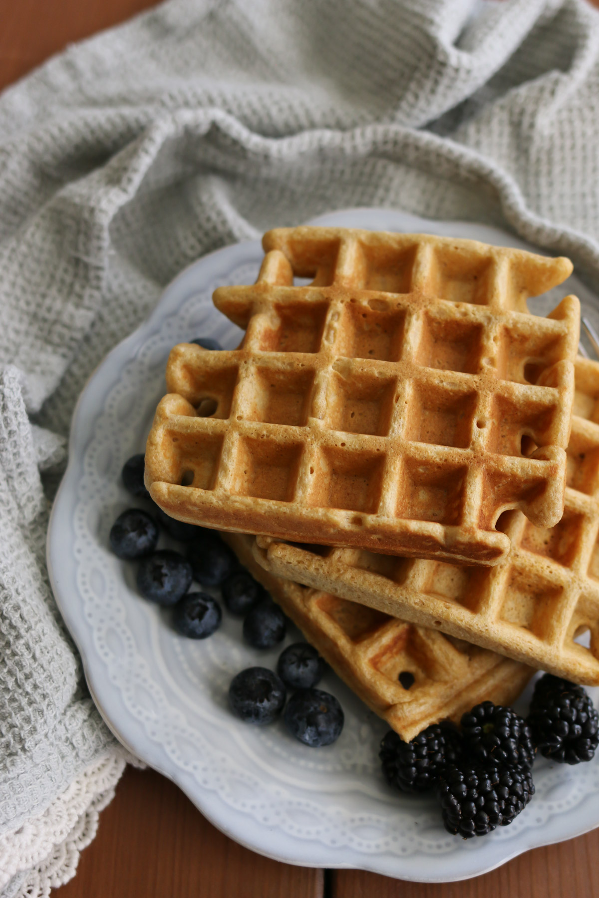 Using just 1 teaspoon of baking powder lets the flavor of your waffles shine, while still giving nice rise. You may lose a tiny bit of air, but I can assure you that it won’t be noticed. You’ll be too distracted by the incredible flavor! (And no buttermilk needed.)